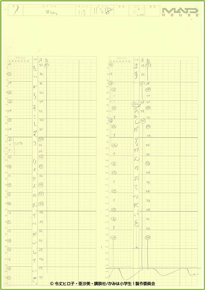 みんなは「タイムシート」って知っているかな?アニメのかいしゃでは大体つかっているシステムのひとつなんだ。この紙にいろんなじょうほうを書き込むよ。原画さんは、タイムシートを使って演出さんや動画さんにつたえたり、撮影さんにもどういうふうに絵がうごくかをつたえたりするんだ!みんな、きっと「そんなの見たことない!」っておもったよね。「タイムシート」は、こんなかんじだよ!