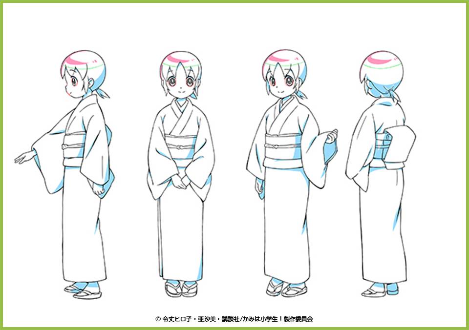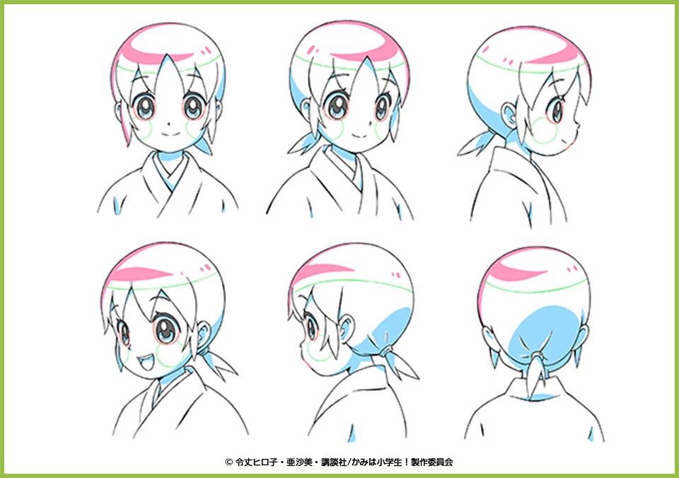「キャラクター設定」は「キャラクターデザイン」をもとにして描くんだ。アニメ専用の、みんなが描く元になる絵だね。キャラクターデザインしたひとがキャラクター設定も描くことがおおいんだ。「キャラクターデザイン」はそのキャラクターのみりょくがわかる絵を描くことが大事で、いきいきとした表情や、かっこいいポーズ、かわいいポーズをかくよ。そして一方、「キャラクター設定」はたくさん絵を描く原画さんたちがわかりやすいようにした設計図なんだ。なぜならアニメは「動く絵」だからね。……ずっとかっこいいポーズのまま動かなかったりするヒーローはいないよね?ふつうに歩いたり、ジャンプしたりするからね。場合によっては地面に座ったりもするかもしれないし、荷物を運ぶこともあるかもしれない。ヒロインのかわいい女の子だって、ずっとかわいいポーズのまま動かないことはないよね?ときにはころんじゃったり、いさましく敵に立ち向かうこともあるかもしれない。だから、原画さんたちが立体的にとらえやすいようにキャラクターデザインの絵を説明した設計図が「キャラクター設定」なんだね。いまのテレビアニメは、時間が限られているから実際にはその2つを兼ねるものを描いちゃう事がほとんどかな。なかなかこれを同時にこなすのは難しいんだけど、朝来(あさき)さんはすごくじょうずだから、すてきなかんじにまとめて描いてくれたよ!次回はキャラクター設定の絵をみながらお話しようかな。じゃあ、またねっ!